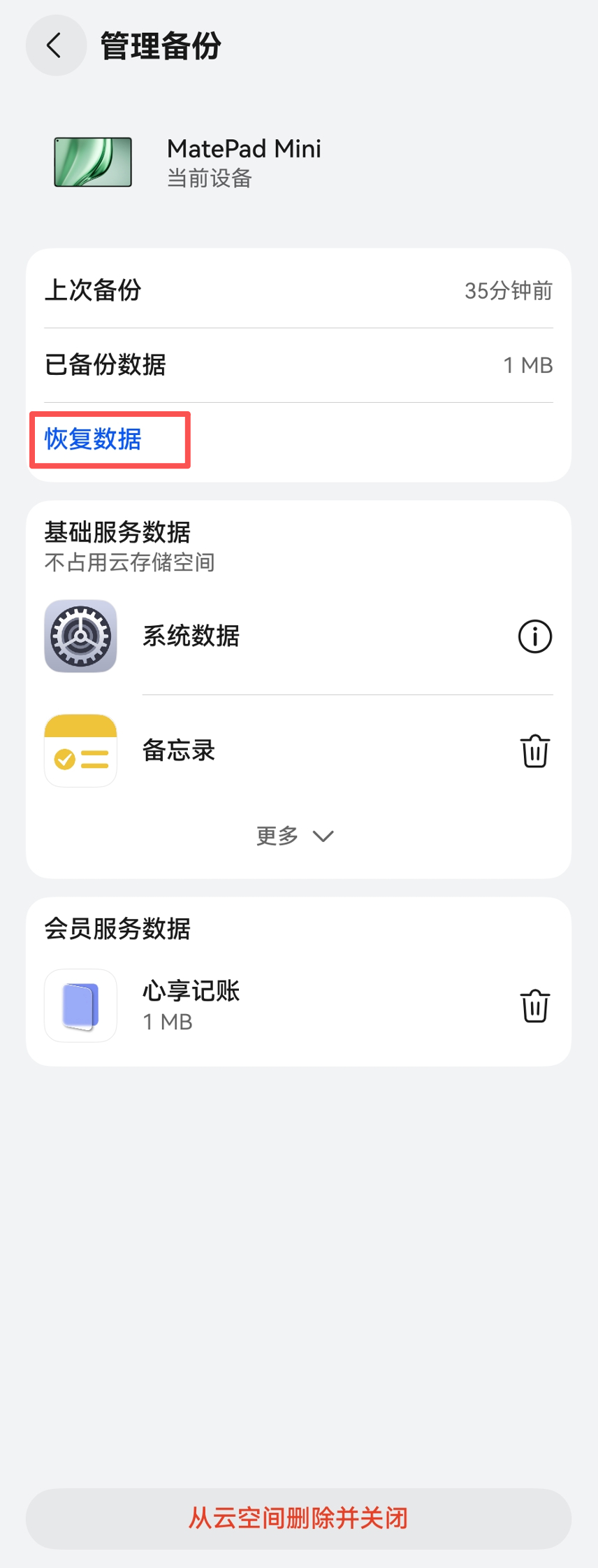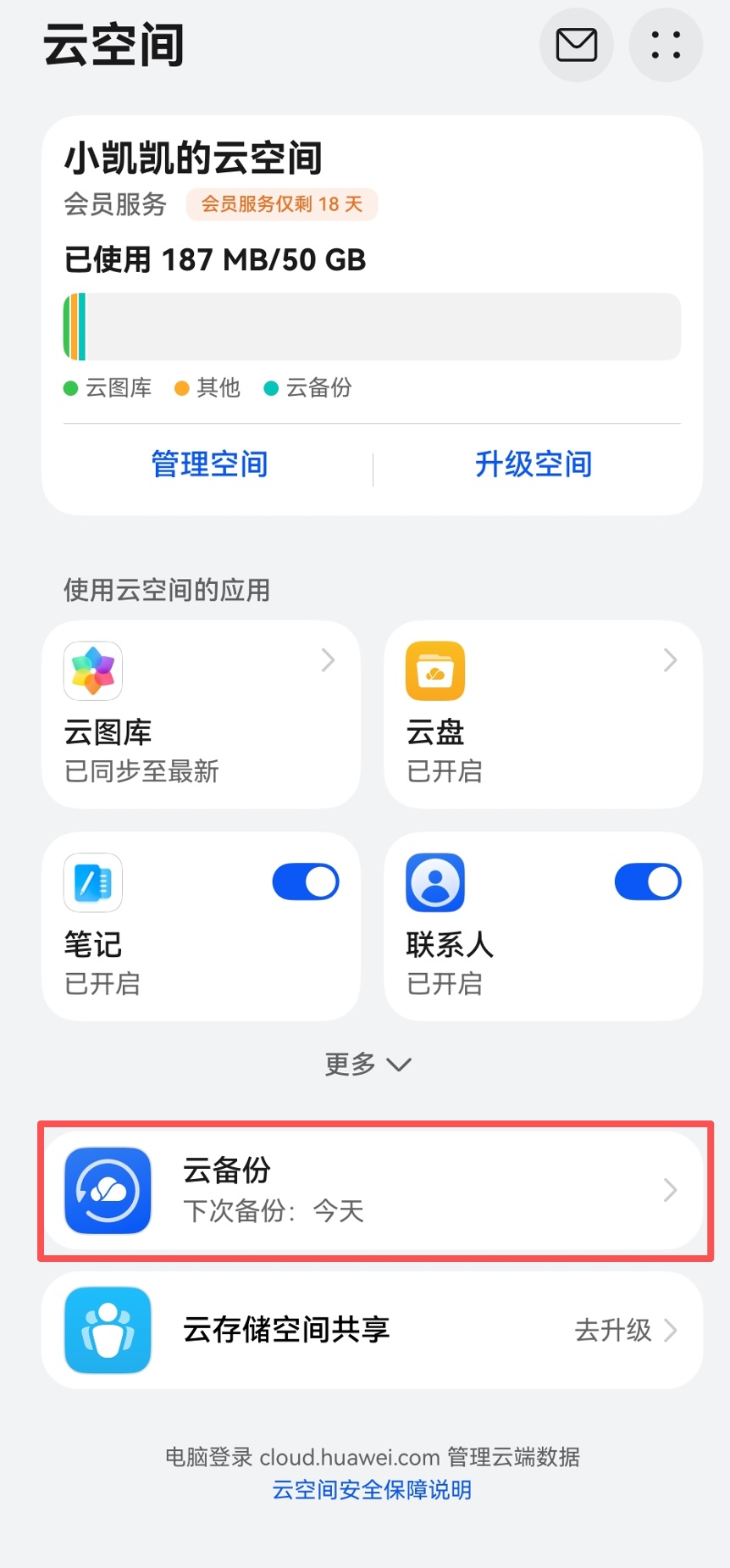 帮助文档备份/还原华为云备份此功能仅HarmonyOS5.0以上鸿蒙系统支持,且版本需为1.1.0及以上。 备份 1.打开设置选择云空间 2.选择云备份 3.启用心享记账的备份功能 4.立即备份 恢复 1.点击备份的设备 2.恢复备份 最后更新于: 2025年9月21日微信导出教程本地备份